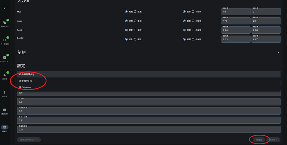 最適化画面にて、探索方式として改善期待値/改善確率/平均を選択し、各目的変数の最大化/最小化/非制御/目標値を選択してください。