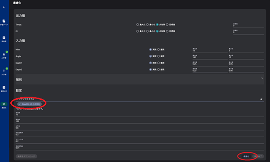 AI学習画面の下側にAIモデルが作成されましたら、左側コンソールの「最適化」をクリックして、最適化画面に移ってください。