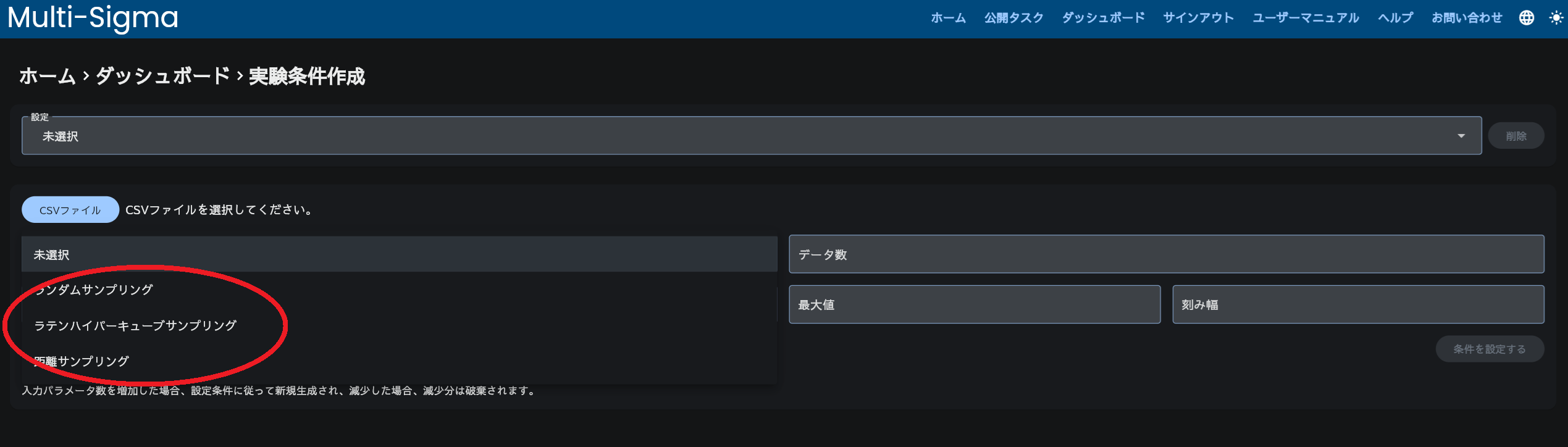 下記画面にて、生成オプション(ランダムサンプリング,ラテンハイパーキューブサンプリング(ラテン超方格),距離サンプリング)、実験データ全体のデータ数、入力パラメータ数、(最小値、最大値、刻み幅)を入力して「条件を設定する」をクリックしてください。