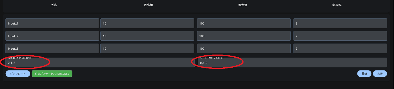 ソート(カンマ区切り)項に、昇順の場合は0を、降順の場合は1を設定してください。入力パラメータ数と同じ数の設定が必要になります。