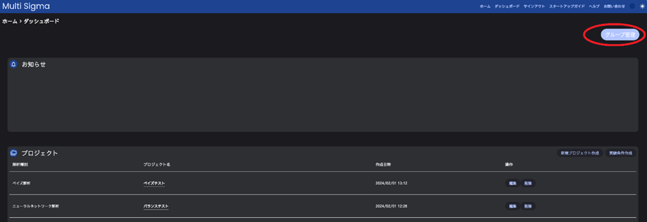グループ管理者権限にて、「グループ管理」をクリックすると、グループ管理画面に遷移します。