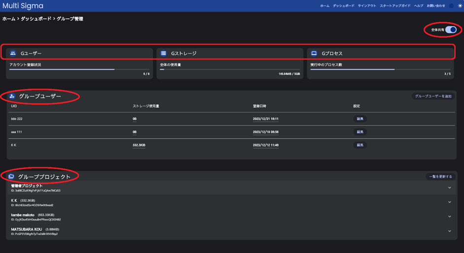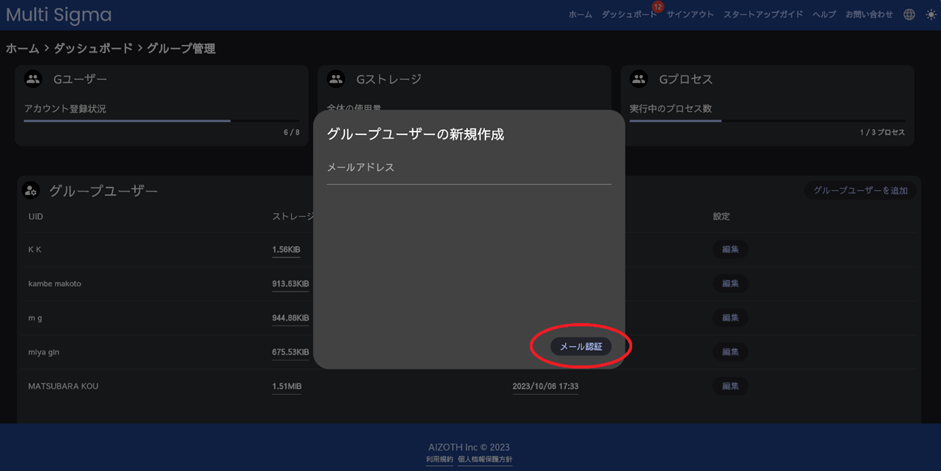 グループ内のアカウント登録状況(ユーザー数)を表示します。