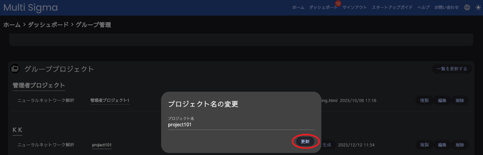 プロジェクト名を変更後に、「更新」をクリックしてください。