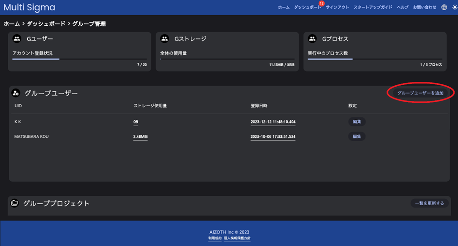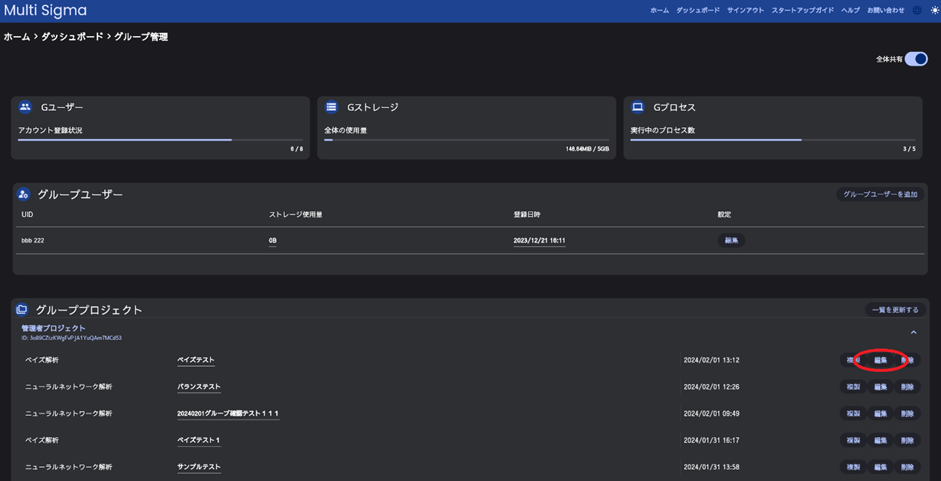 グループユーザーを編集する場合は、各々のグループユーザーの「編集」をクリックしてください。