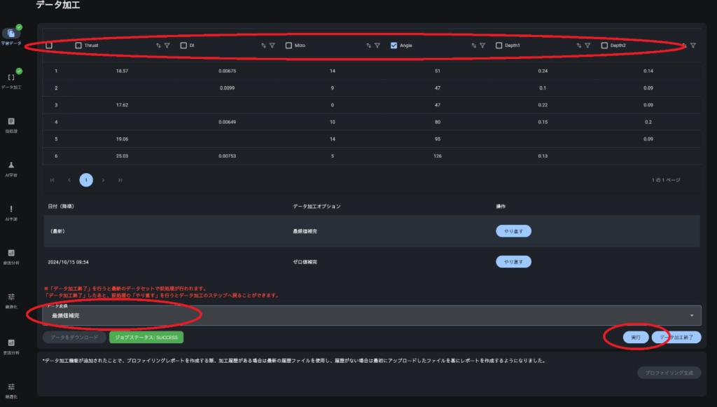 データに空白などの欠損値がある場合に補完することができます。補完する必要が無い場合は、「データ加工終了」をクリックしてデータ加工を終了してください。