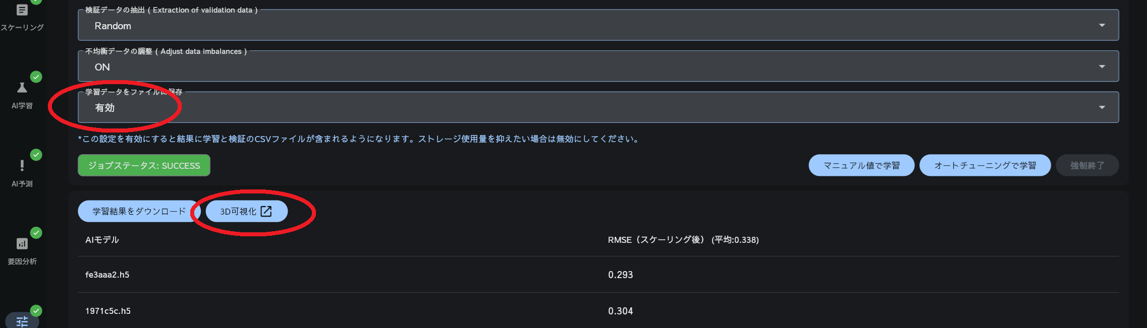 精度よく解析したい場合は 「オートチューニングで学習」 クリックしてください。数時間から半日程度かけて、精度良く予測するためのAIの学習条件を自動で探索します。アプリを閉じたり、PCをシャットダウンしても処理は継続します。オートチューニングではAIモデルが10個生成されます。