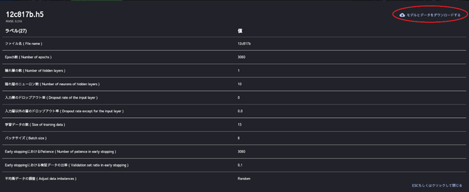 また、作成した各モデルを選択すると、モデルと、モデル情報、学習・検証データがダウンロード頂けます。