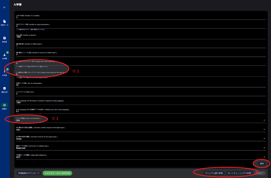 簡単に解析を試したい場合は、デフォルトの設定のまま画面下の「マニュアル値で学習」をクリックください。AI学習が終わると、画面下部に学習済みのAIモデル名が表示されます(数分程度かかります)。