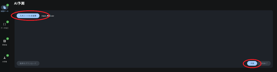 ※ AI予測の入力ファイルには、AI学習時の入力ファイルと同じ列名の先頭行が必要です。