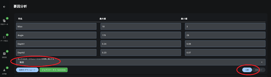 要因分析画面において、「モンテカルロ・シミュレーションを同時に実行する」の有効/無効の選択、「分析」をクリック頂くと、要因分析の結果が表示されます。