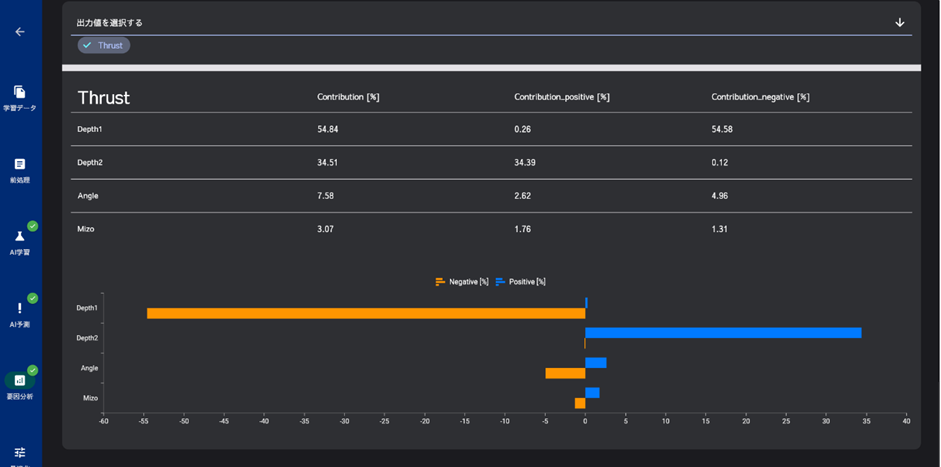 Contributionは、各説明変数の各目的変数に対する寄与度(影響の大きさ)を表しており、Contribution_positive、Contribution_negativeは、それぞれ、各説明変数による各目的変数に対する正の方向と負の方向の寄与度を示しています。説明変数の範囲(最大値・最小値)を変えると、影響度の大きさが変わります。
