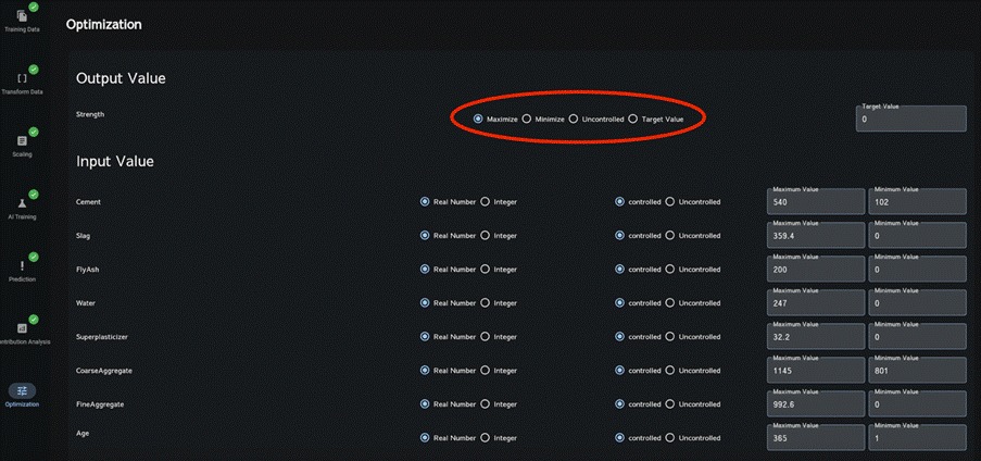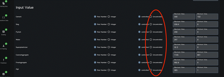 If any explanatory variables (inputs) cannot be controlled, select Uncontrolled for those variables. The optimization will then be performed for the controlled explanatory variables under the assumption that each uncontrolled explanatory variable can take any value between its minimum and maximum.