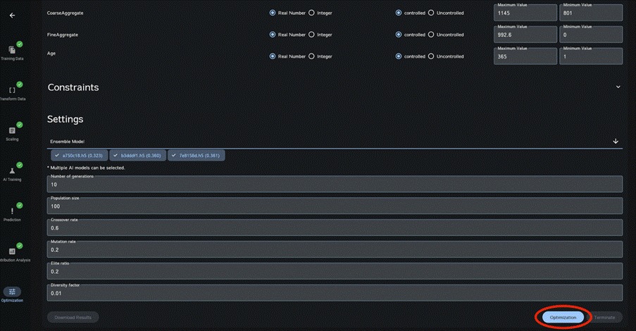 Once an AI model appears at the bottom of the AI Training screen, click Optimization in the left-hand sidebar to open the optimization screen.