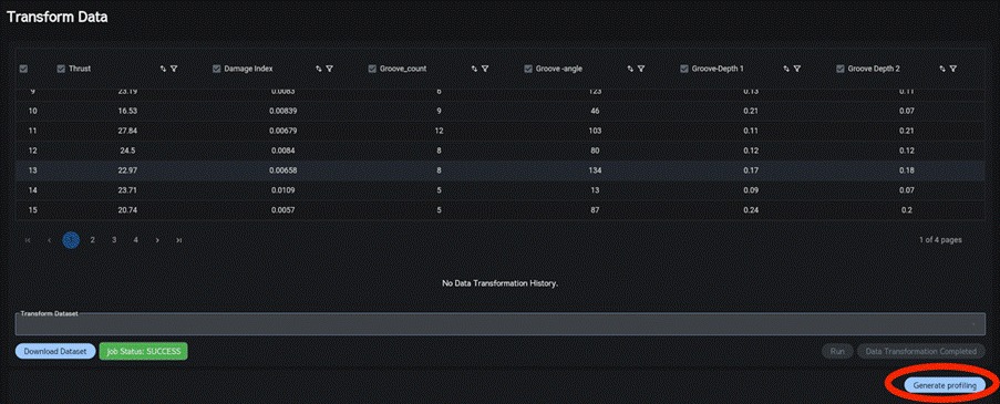 Once the user uploads the training data in a new analysis task, statistical analysis can be performed prior to model training. In the “Transform Data” section, fundamental data analysis and correlation statistics of the training data can be accessed by clicking the “Generate Profiling” button. This file contains histograms of the data distribution for each column and the correlation coefficients between the data in each column.
