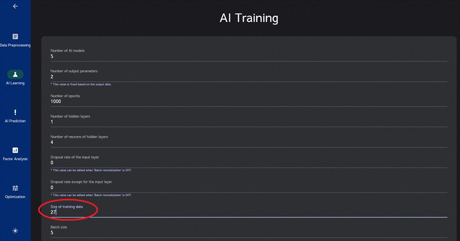 By default, in AI training, 90% of the uploaded data is used for training, and the remaining 10% is set aside for validation to evaluate the prediction accuracy of the AI model (the number of training data is displayed in the “Size of training data” field).