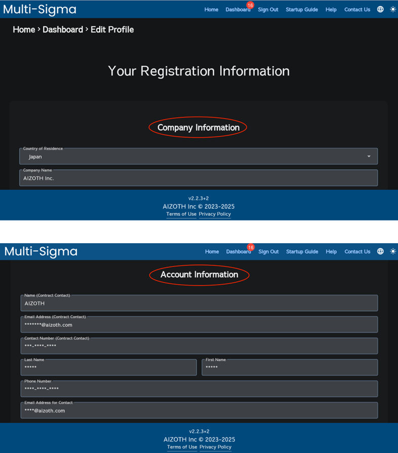 To update your registered information, click on the “Dashboard” tab, scroll to the very bottom where you will see an “Edit” button, and click it. You will find input fields for “Company Information” and “Account Information.” Fill in the updates as needed and then click the “Update Registration Information” button.
