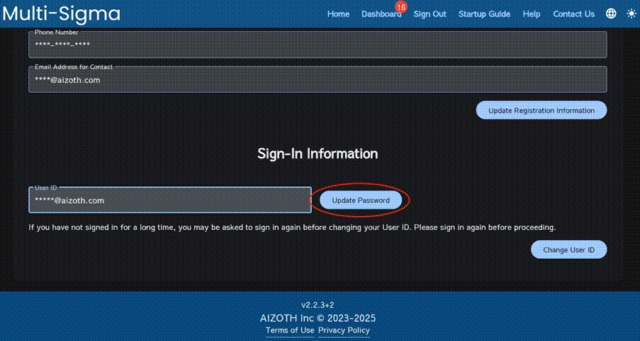 To change your password, follow the same procedure as updating your registered information: click on the “Dashboard” tab, scroll to the very bottom where the “Edit” button will appear, and click it. Then, scroll all the way down again to find the “Update Password” button. Click the button to change your password.