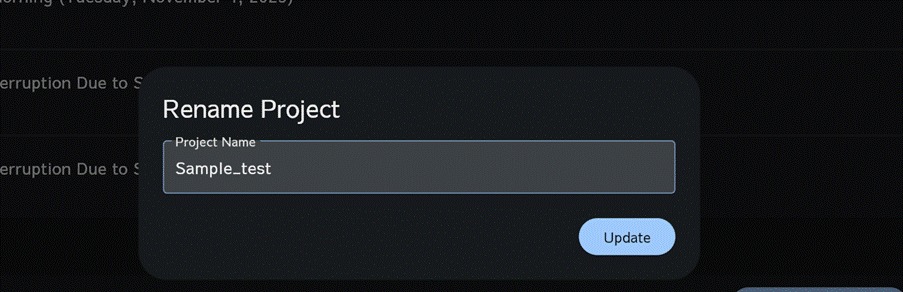 The project can be renamed at any time: click the “Edit” button for the project to open the Rename Project window, enter the new name, and then click “Update.”