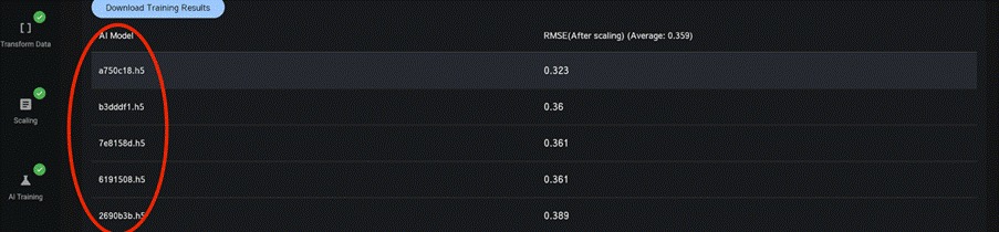 For a quick analysis, please click on Manual Training at the bottom of the screen, keeping the default or specified settings. After AI learning is completed, the trained AI model name will be displayed at the bottom of the screen (this may take a few minutes).