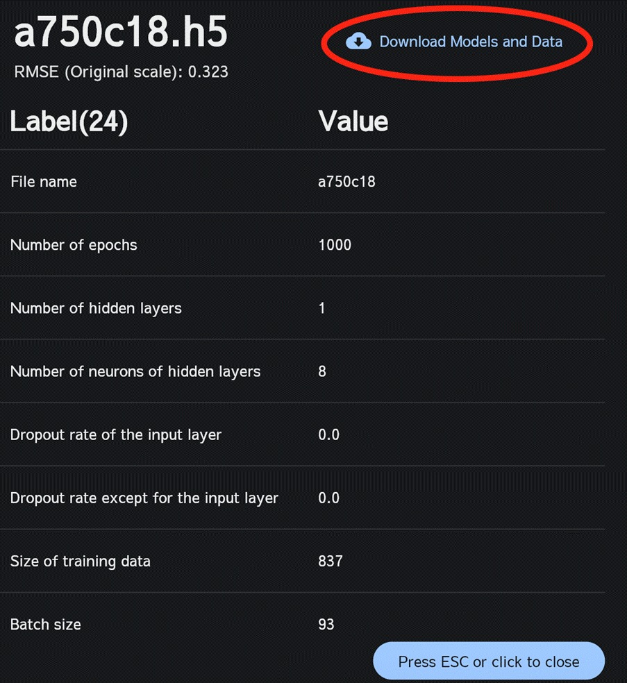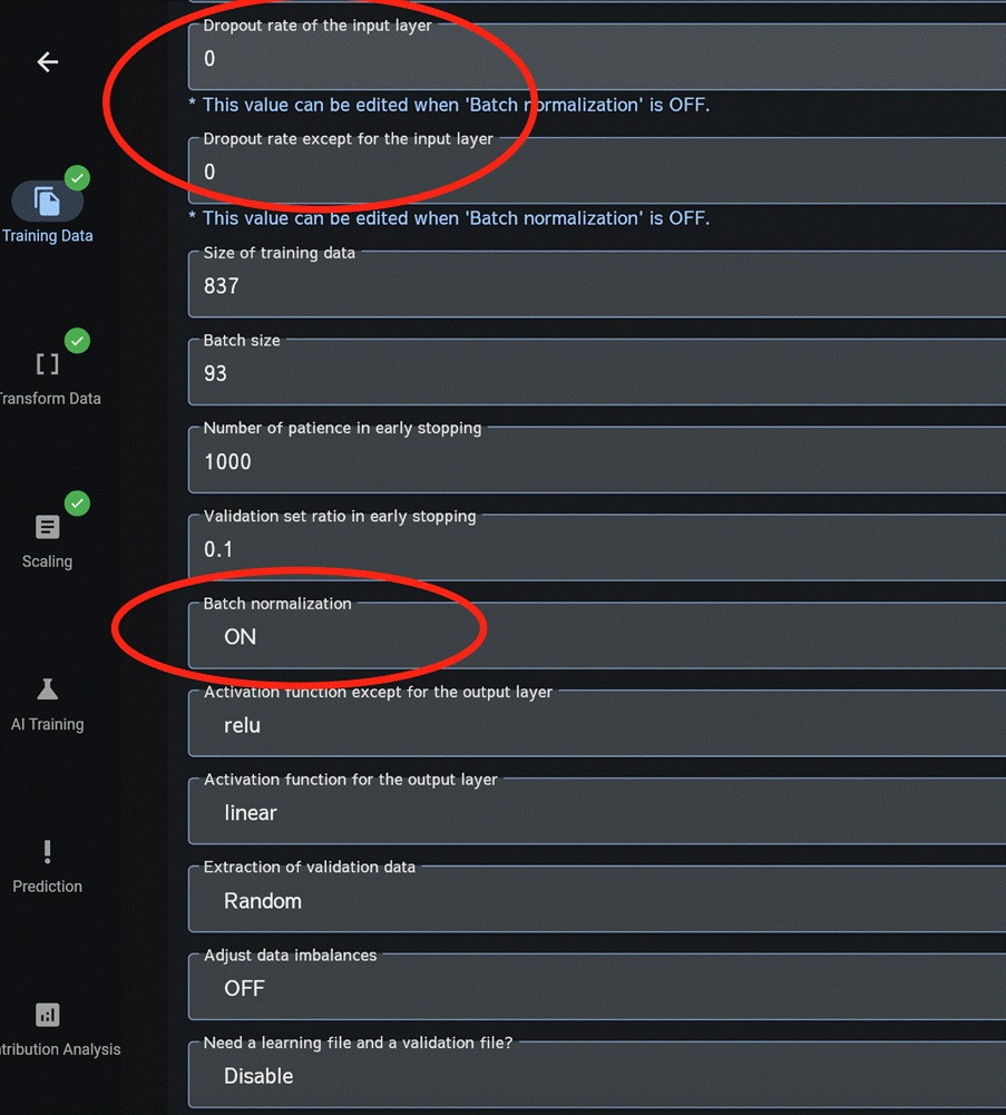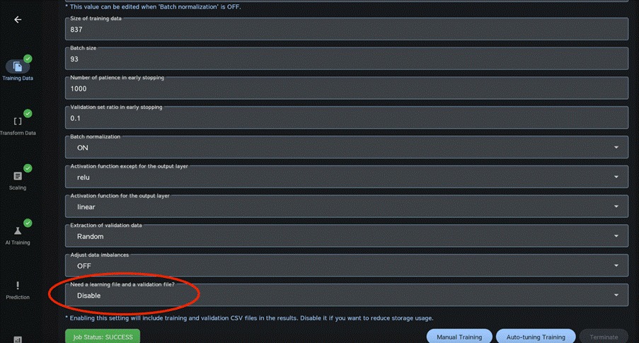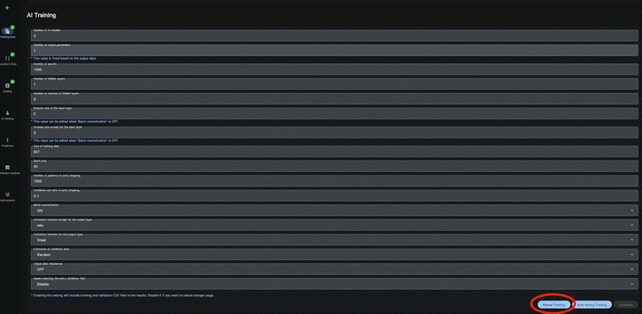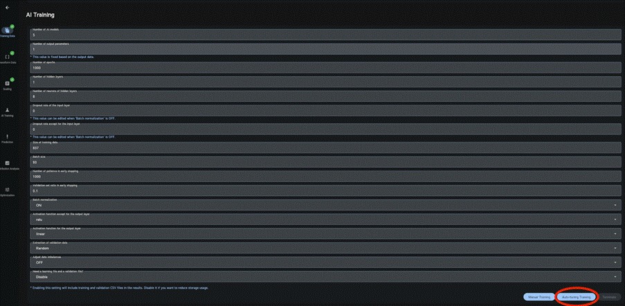 If you want to perform a more accurate analysis, please click on Auto-tuning Training. This option will automatically search for optimal AI training conditions to achieve high predictive performance, and it may take several hours to half a day. The process will continue even if you close the app or shut down your PC.